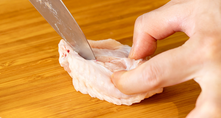 手羽先は先の部分を切り落とし、骨にそって切り込みを入れる。