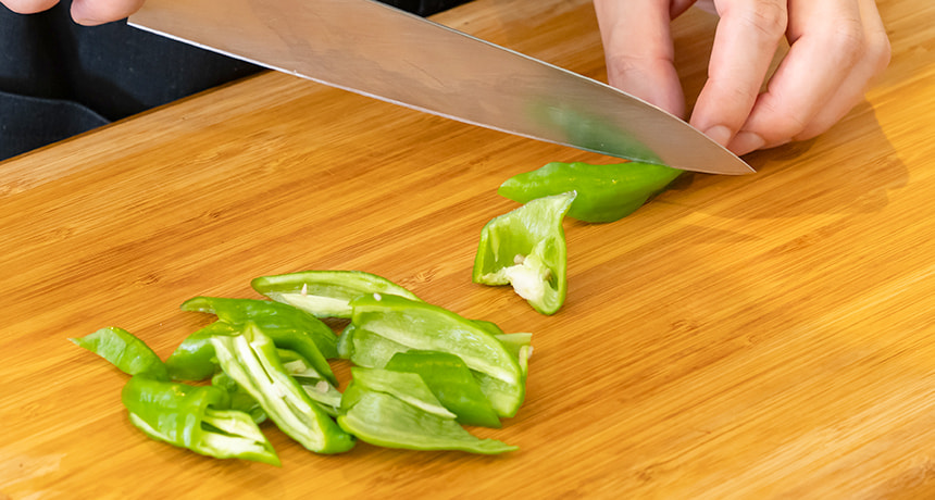 万願寺とうがらしはよく洗い、縦に半分に切って種をとり、3cmくらいの乱切りにする。