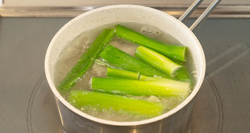 鍋に(1)、臭み消しのためのねぎを入れ、かぶるくらい水(分量外)を入れて中火にかけ、