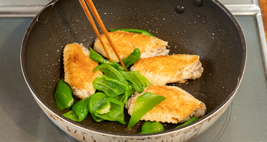 フライパンにサラダ油を引き、手羽先を焼き目がつくまで両面焼く。