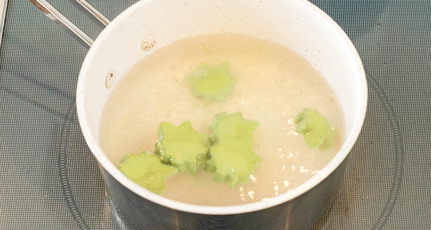 青もみじ麩は5mm程度の厚さに切り、さっと茹で、粗熱を取る。