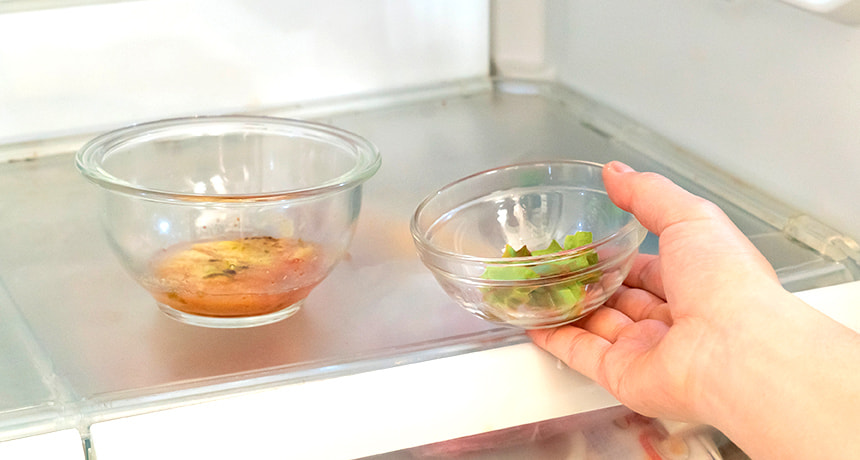粗熱が取れた(7)は半分に切り、(8)とともに冷蔵庫で冷やす。