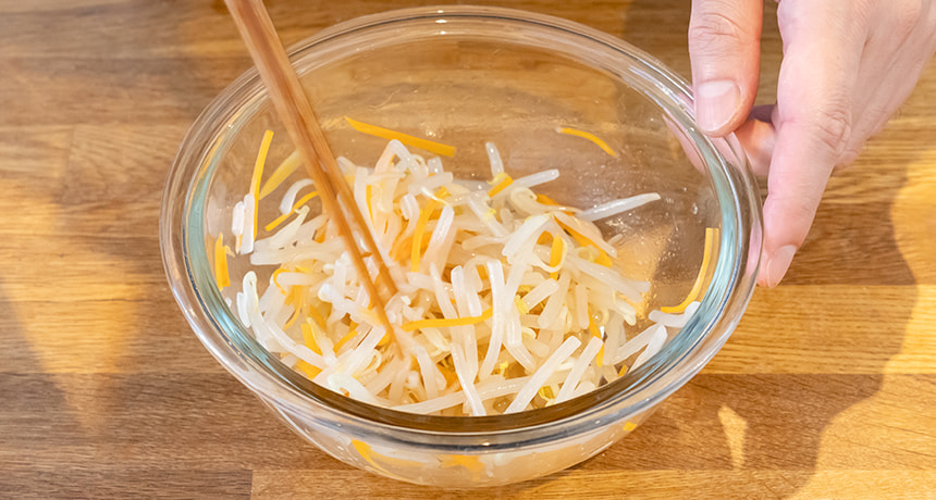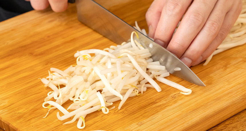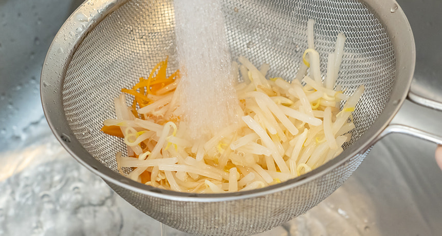 緑豆もやしはよく洗ってから、3cmくらいに切る。