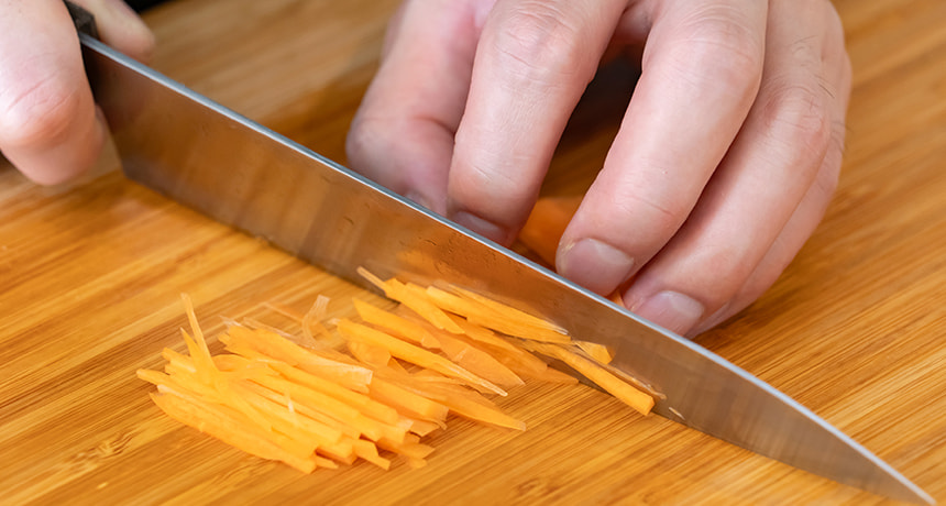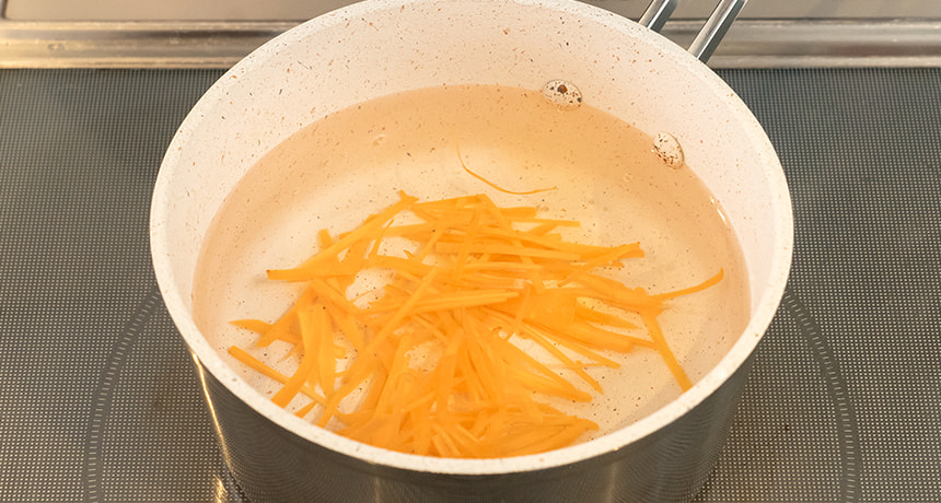 にんじんはよく洗い、皮を剥いてせん切りにする。