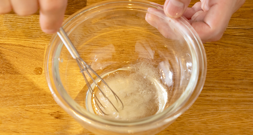 【A】をよく混ぜて甘酢を作る。溶けにくい場合は電子レンジ500Wで20秒加熱する。