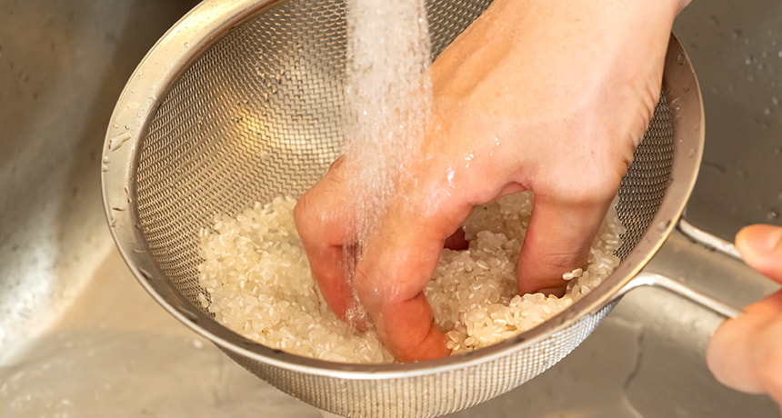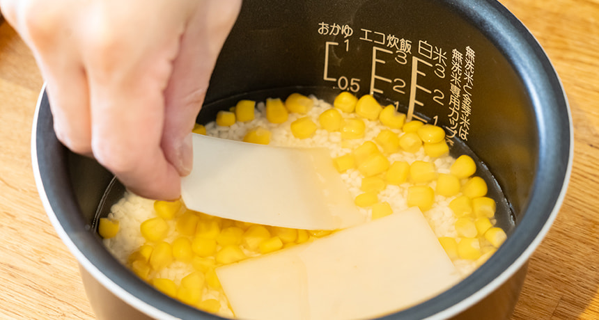 艶出しと旨味をプラスするためのみりんを加え、さらにスライス餅をのせ、通常モードで炊飯する。