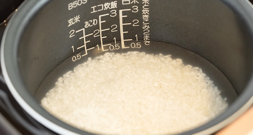 内釜の表示を目安に通常の1合分の水(分量外)を入れる。