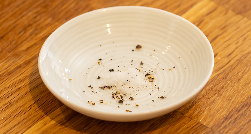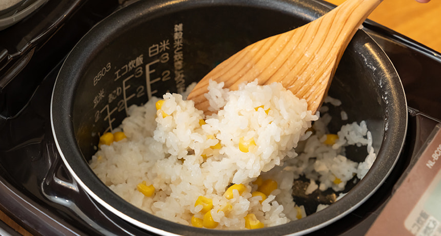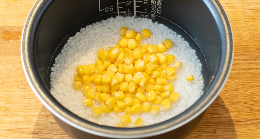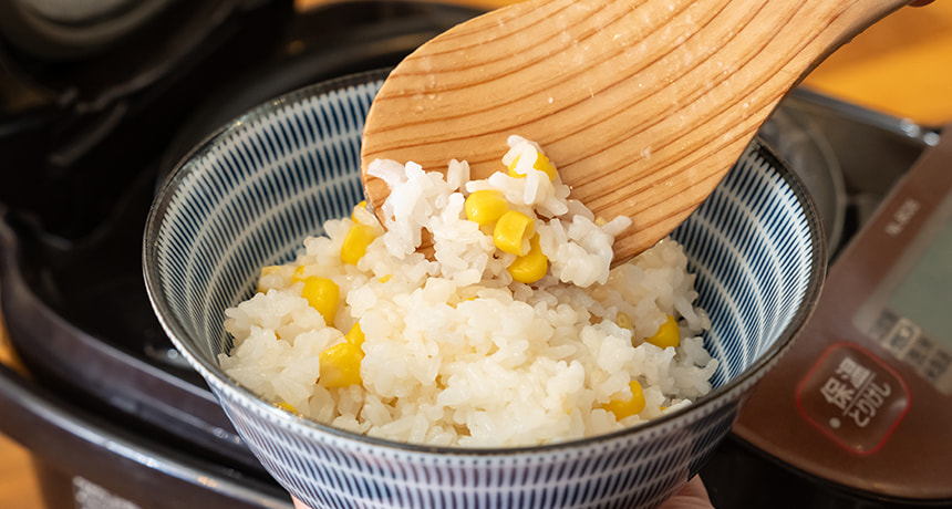 食塩とブラックペッパーをふりかけながら食べると、香りもよく、とうもろこしの甘みがより強く感じられます。スライス餅を加えることで、ご飯がもっちりした食感になり、とうもろこしの粒とまとまりが良くなって箸で食べやすくなります。