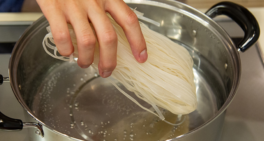フォーは表示通りに茹でたあと、水でさっと洗い、ざるにあげてしっかり水気を切っておく。